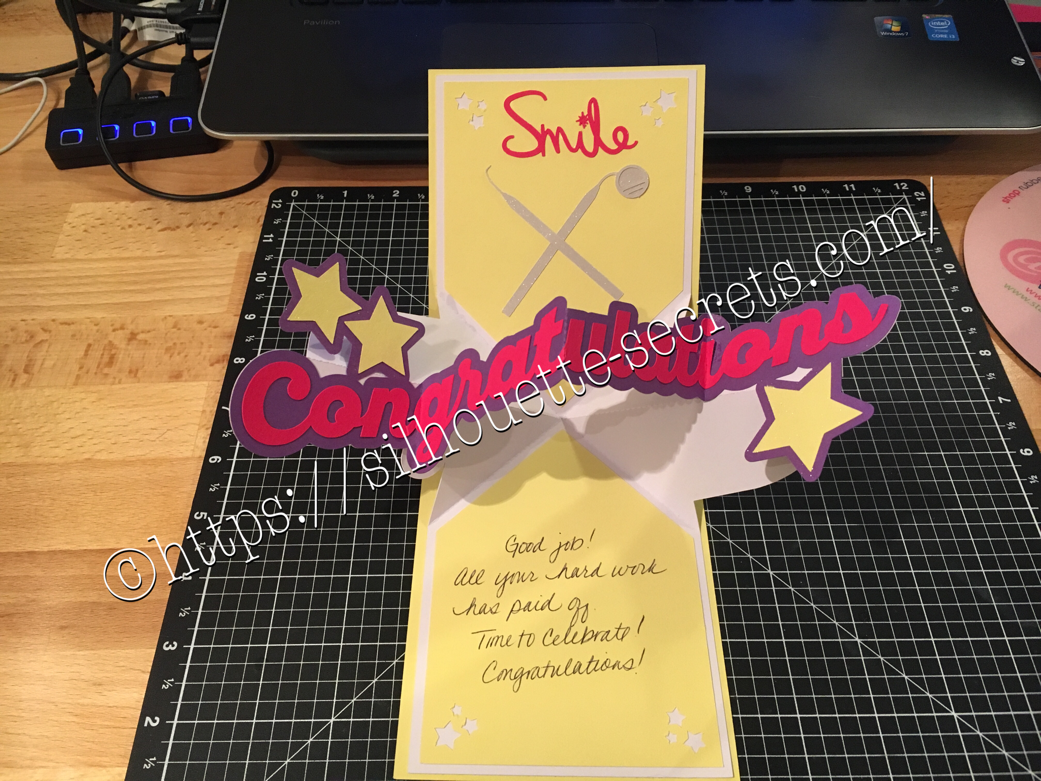I love being able to create these customized cards for friends, especially for special occasions… A friend of mine just received the results of her dental hygiene exam and I thought I would create a unique card for her. I found all the designs in the Silhouette Store and loved that I could just click buy and then get to cutting. You can find the Congratulations Pop & Twist card file HERE. Find the Tooth file HERE. Find the Dentist tools HERE.