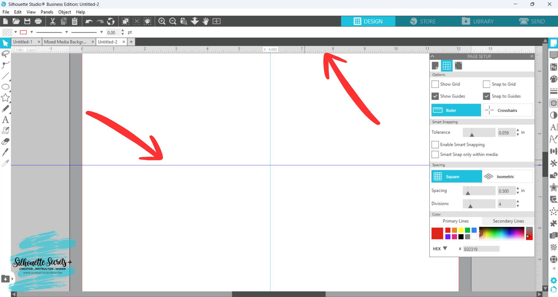 Guides can be pulled from the rulers on the top or right side of Silhouette Studio. Guides are a Designer Edition upgrade feature along with Rulers.