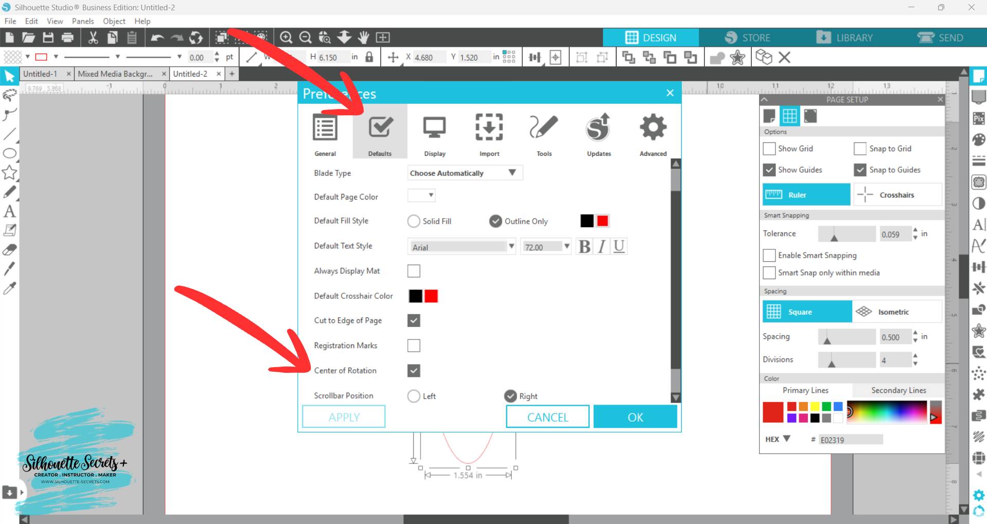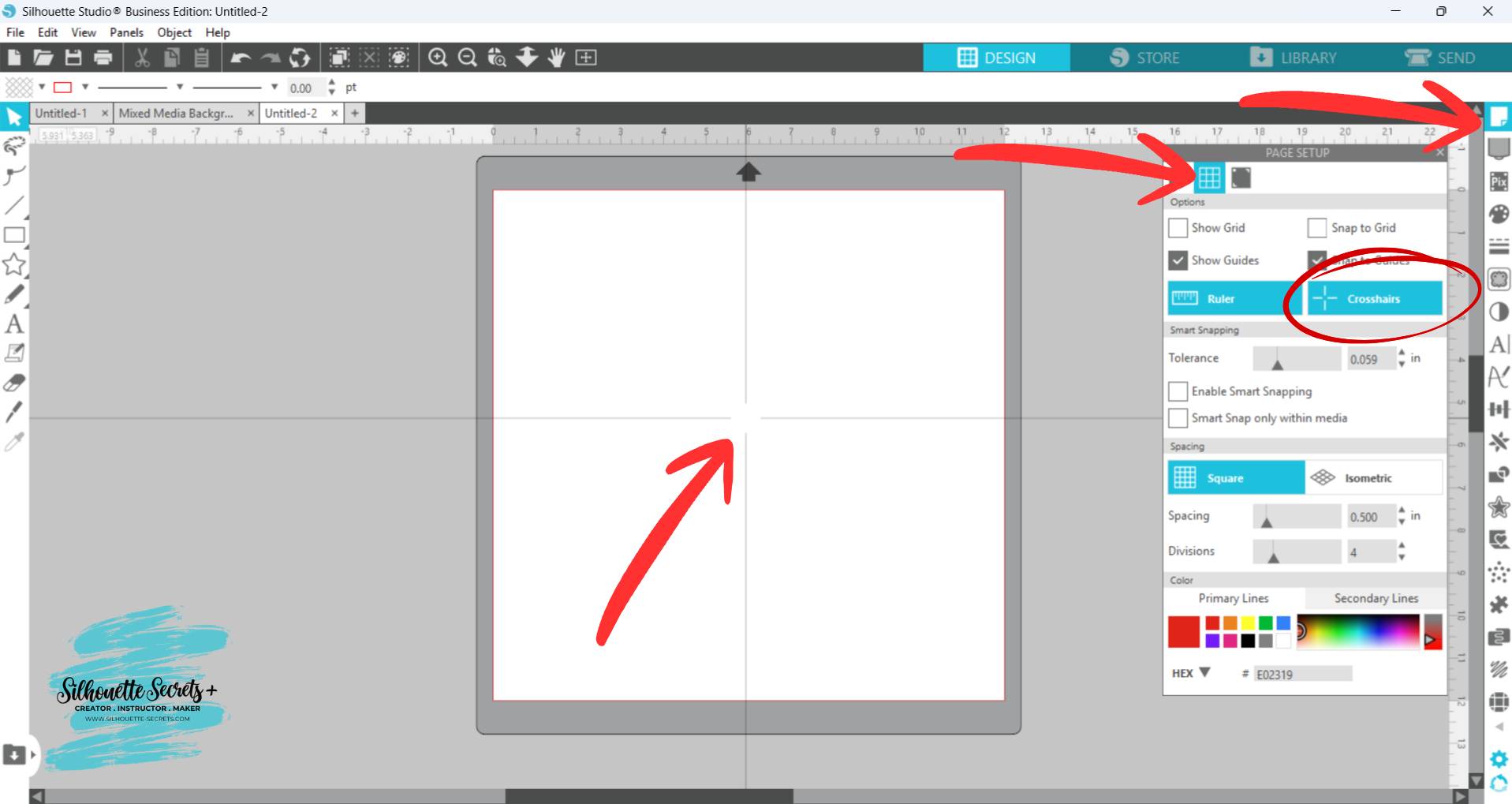 - Open the Page Setup Panel, click on Tab 2, and click the Crosshairs button.